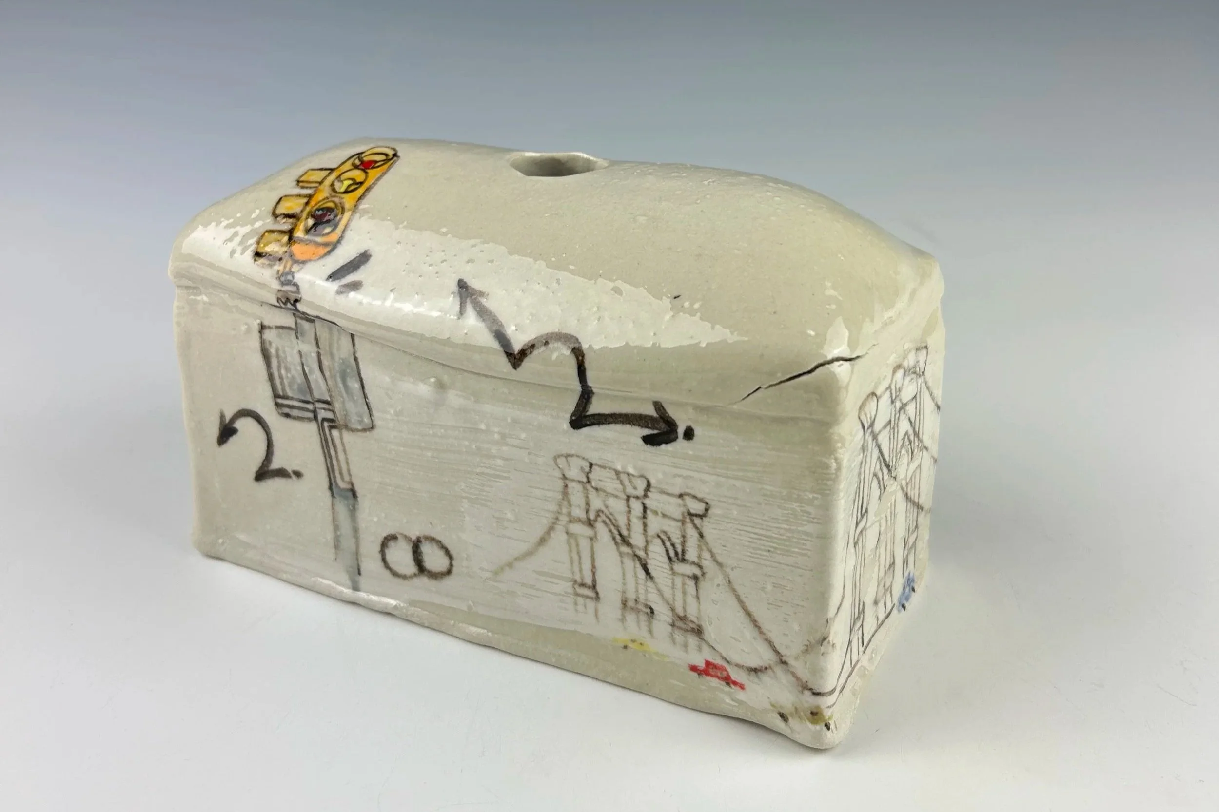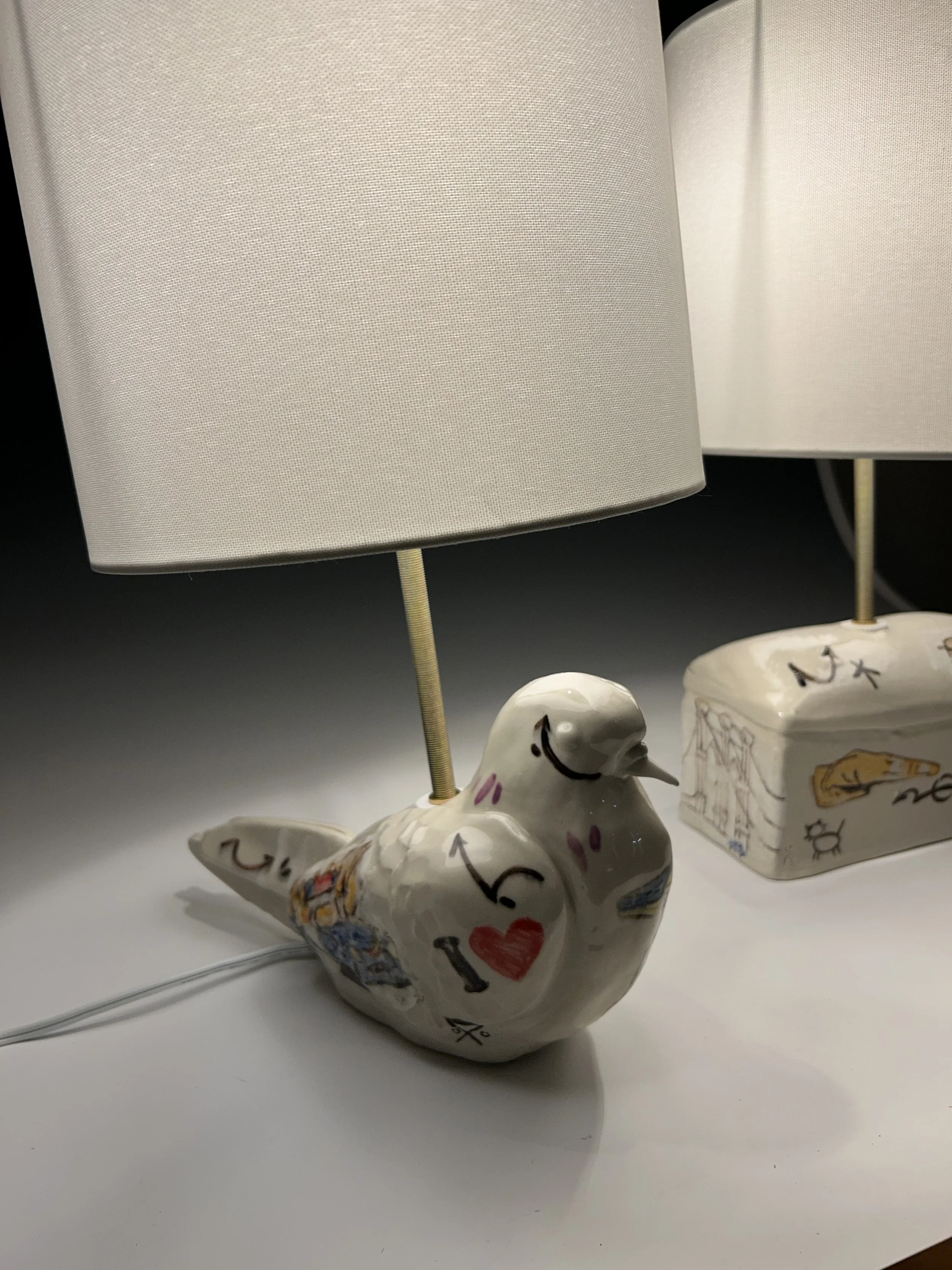 These are a matching set of table lamps, pigeon and bread. I covered them in nyc iconography and hobo symbols.