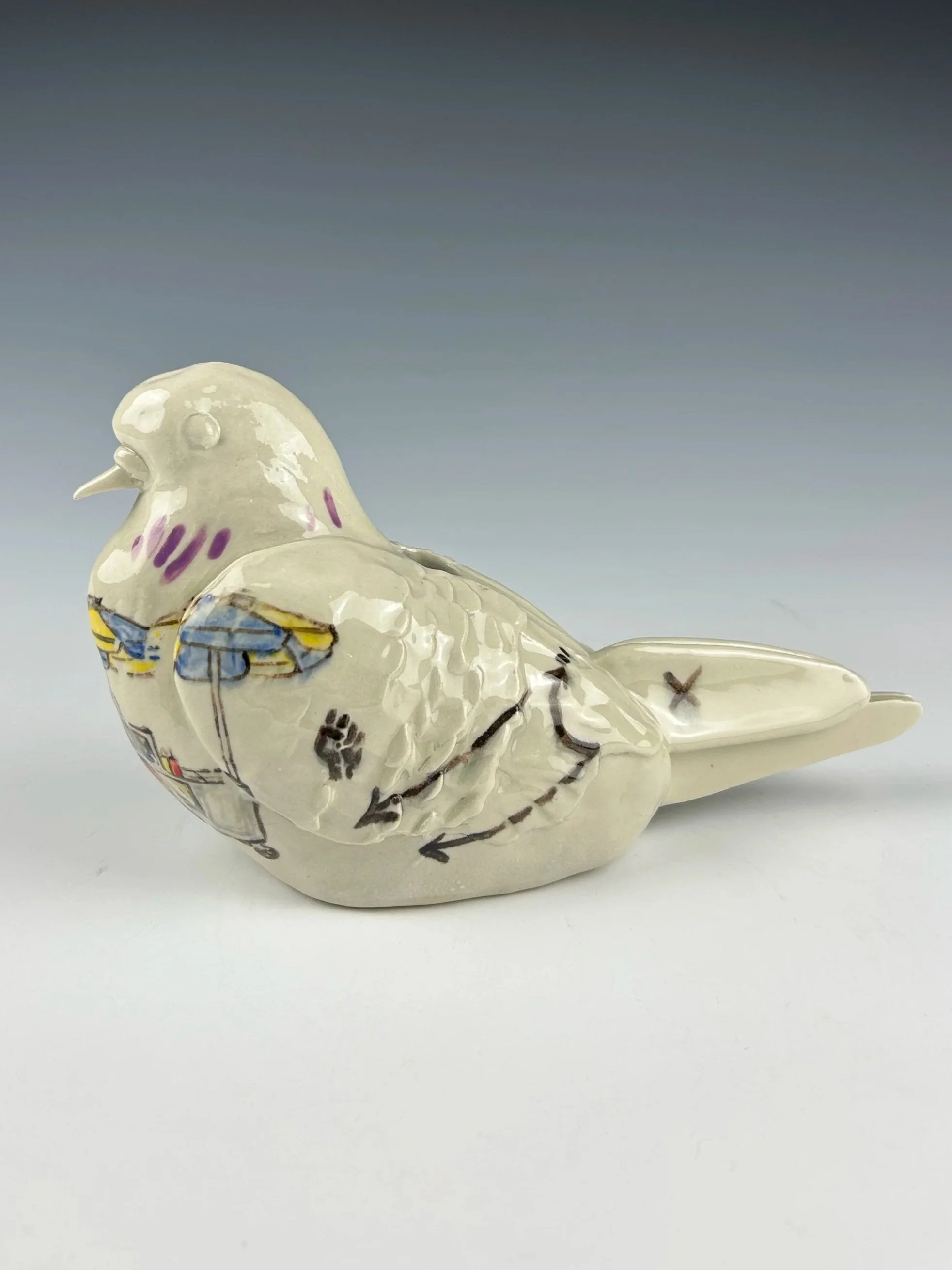 I have always loved pigeons and all the implications that come with their bad wrap. I feel very akin to them and their odd personalities. My favorite detail is the hot dog stand.