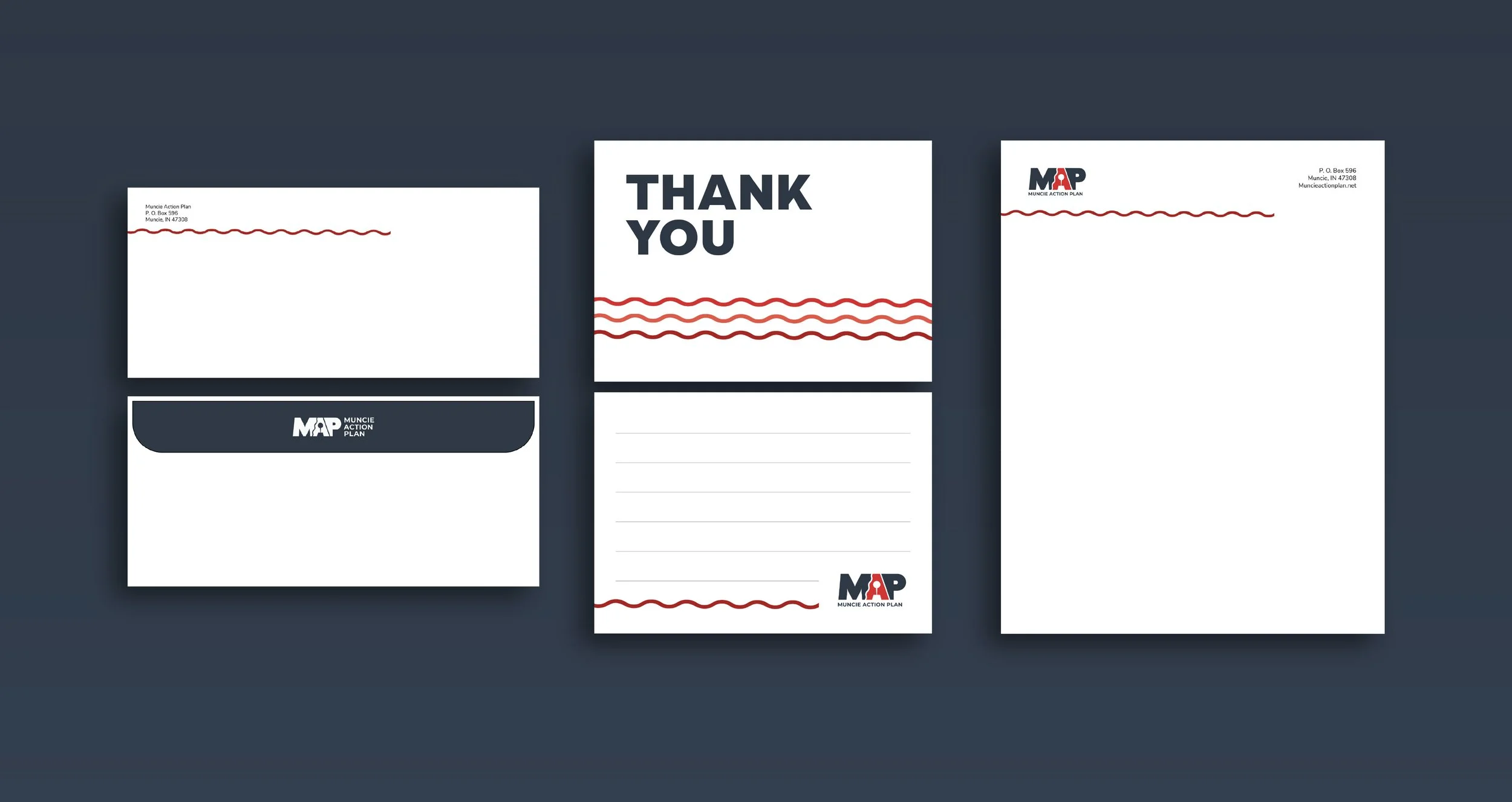 The redesigned identity honors MAP's existing brand while modernizing its visual language. The result is professional and flexible enough to work across all their communications, reflecting their mission to support and guide Muncie's community growth.